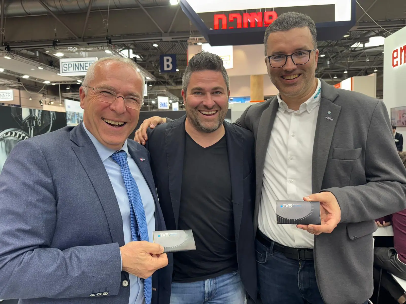 🍫 Gestern überraschte er auf der Intec und Zuliefermesse Z in Leipzig u. a. Wolfgang Feuerhahn (links) von der Maschinenfabrik Berthold HERMLE AG und Lars Neitzel von der PRAGMA GmbH Zittau mit dieser besonderen Leckerei. 😉