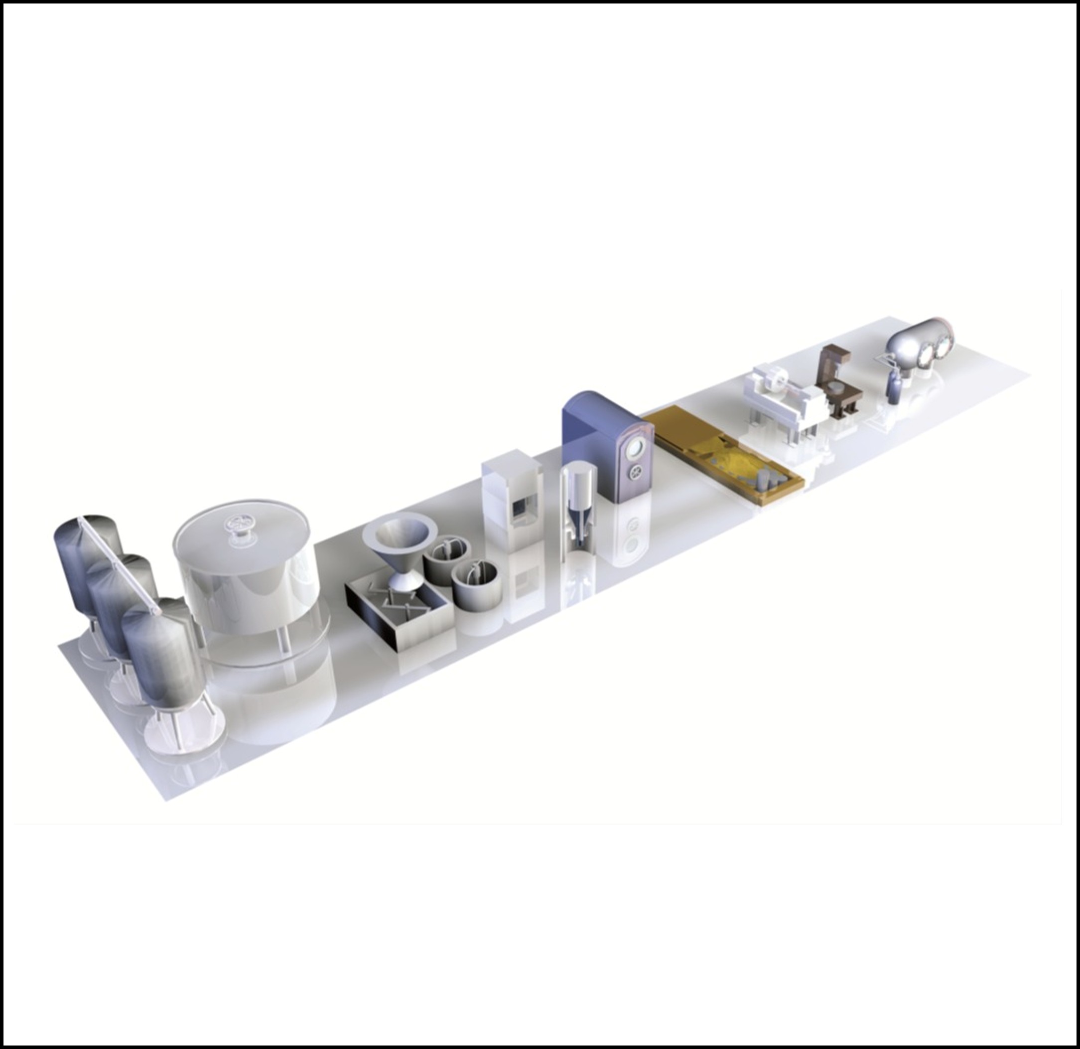 💠Das Verfahren ist sehr komplex und zeitaufwändig. Im Bild seht Ihr das Modell einer Fertigungsstraße, die im Herstellungsprozess von links nach rechts durchlaufen wird; dieser läuft ganz grob so ab: Zuerst werden Rohstoffe gemischt, dann kommt das Pressen und Brennen und schlussendlich kommt das Graphitieren.